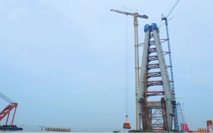 常泰长江大桥主航道桥主跨1176m,主塔总高352m。采用XGT15000-600S塔机进行上部钢塔柱施工吊装仅需将钢塔柱划分为30个吊装单元,最大单元重量超500t,较传统施工方式效率提升60%以上。
