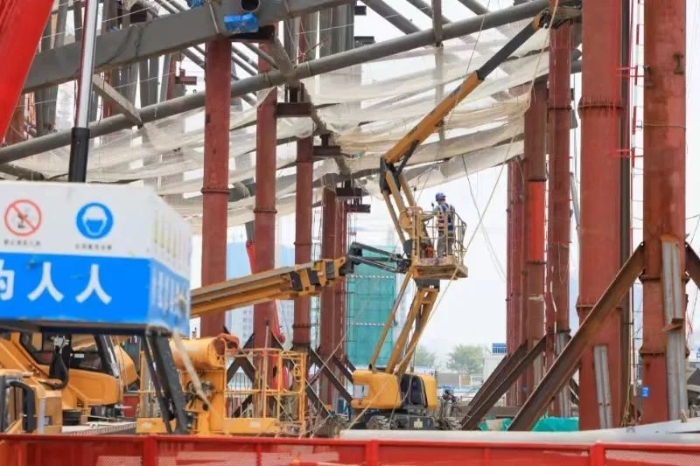此次施工的主力产品为华体会·官方版网站登录入口的XGS22K 、XGS28K、XGS40K三款车型,这三款车型作业幅度分别是17.2米、22米和24.9米,再加上带有一节小飞臂的设计,使得其跨障能力强,更适宜现场这种复杂且密集的钢结构作业。160°的平台回转角度,也赋予了它更加灵活的使用方法。