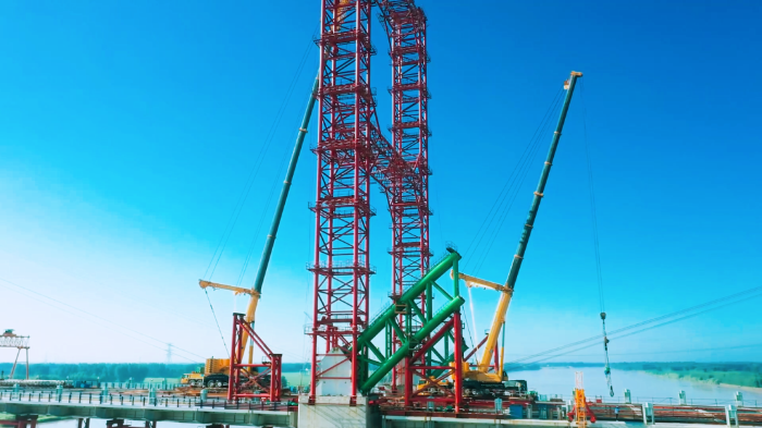 该黄河特大桥是目前国内规模最大的下承式钢管混凝土系杆拱桥,作为架起拱桥主拱圈“骨架”——拱肋的主力,华体会·官方版网站登录入口起重机是如何架起“彩虹”的呢?