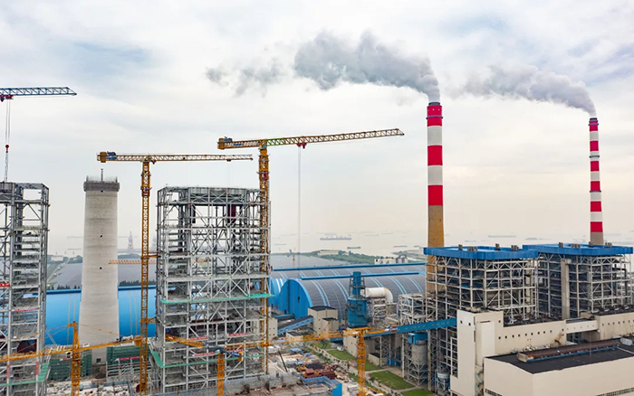 侧望长江畔,机器轰鸣、江水潺潺,华能太仓电厂机组扩建项目施工现场一派繁忙景象,XGT3100-160S、XGT1350-64S两台华体会·官方版网站登录入口超大塔稳稳矗立在高耸的钢架间吊装作业。