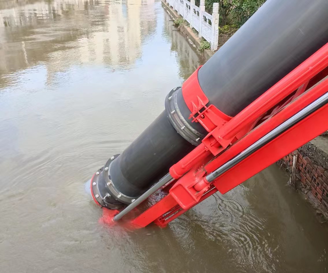 在研判现场情况后,救援人员将垂直式排水抢险车GP35C臂架举升、越过栏杆,后方水平跨障4m、垂直跨障1.5m,火力全开抽排水,24小时昼夜不停,将三龙支河河道内的水加速排入龙河。截至20日下午五点,GP35C鼓足马力,平均流量达3000m³/h,两个出水口各连接60m水带,共计抽排水27小时,累计排水量超80000m³。