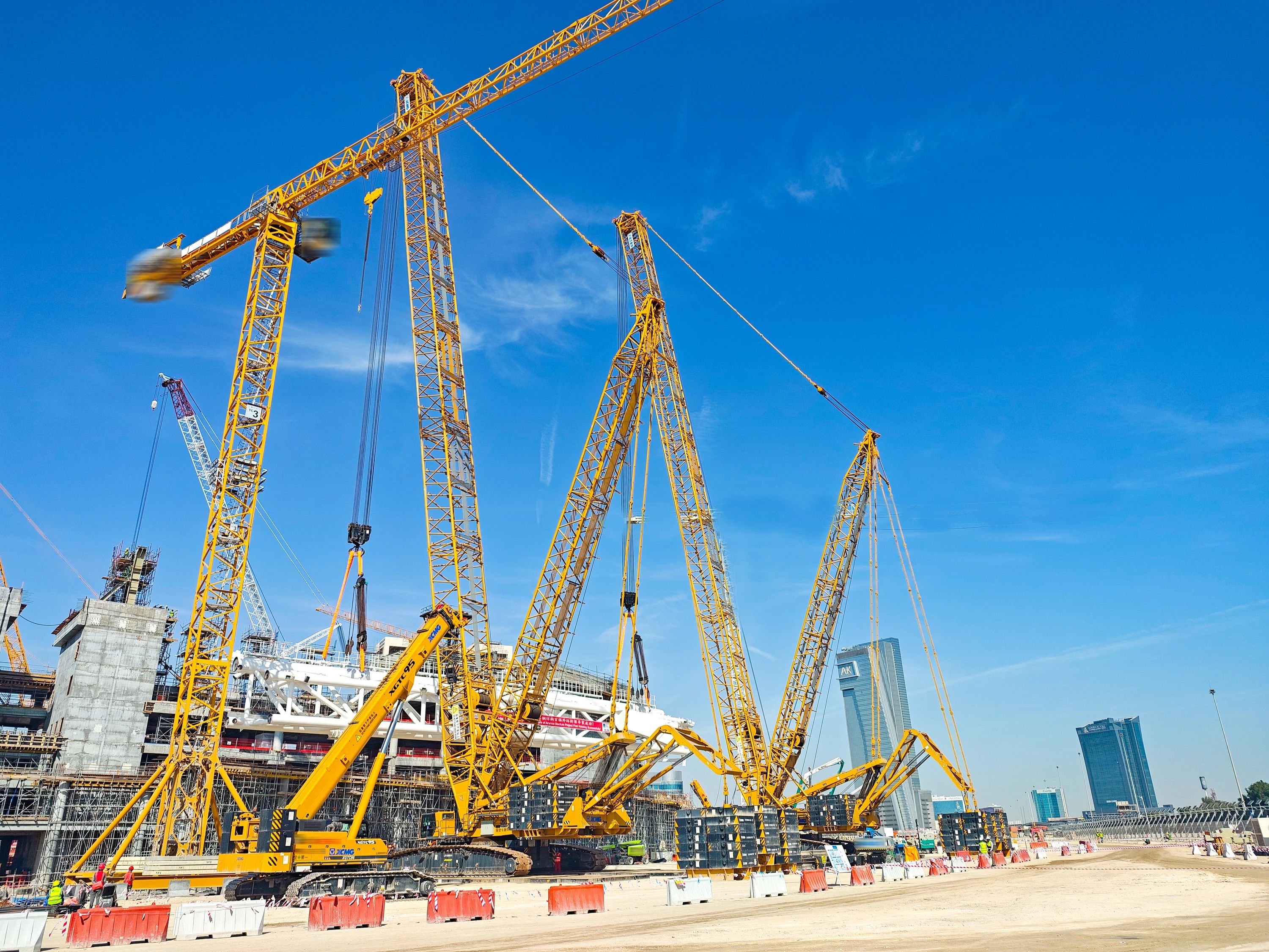 除了“双雄”,华体会·官方版网站登录入口起重机械全系产品也在项目大显神通。XGC400-I高效承担桁架拼装任务,XGC320批量完成看台骨架吊装作业,XGTC95、XGTC55等小吨位设备则灵活穿梭于场馆附属结构安装区域,助力项目节点高效完成。