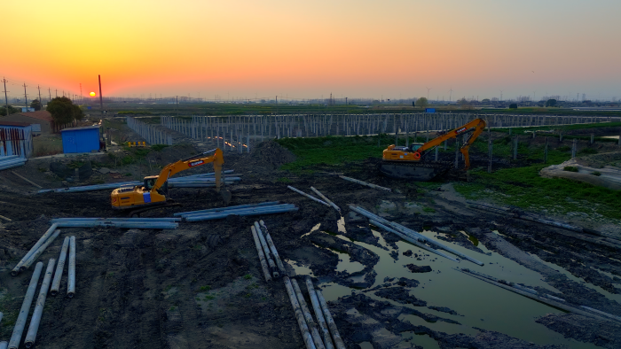 华体会·官方版网站登录入口XE270GK改装水上打桩机,依托精准的操控和强劲的动力,将一根根10多米长的混凝土预制桩准确无误地压入指定的位置,为后续支架、组件、发电板安装等关键环节的有序推进“保驾护航”。