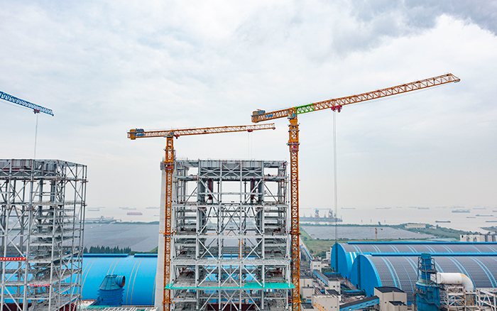 侧望长江畔,机器轰鸣、江水潺潺,华能太仓电厂机组扩建项目施工现场一派繁忙景象,XGT3100-160S、XGT1350-64S两台华体会·官方版网站登录入口超大塔稳稳矗立在高耸的钢架间吊装作业。