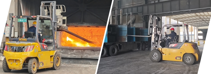 不止新疆,在华东某大型冶金厂,孔雀4.5吨叉车正在进行炉前作业;在华南电解铝行业的强磁车间内,5吨孔雀叉车在进行原材料搬运工作。