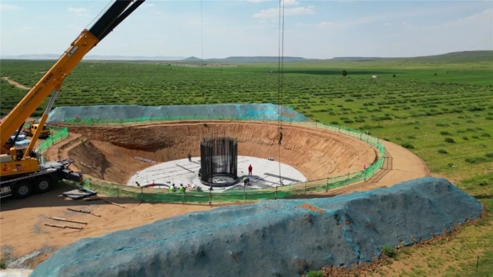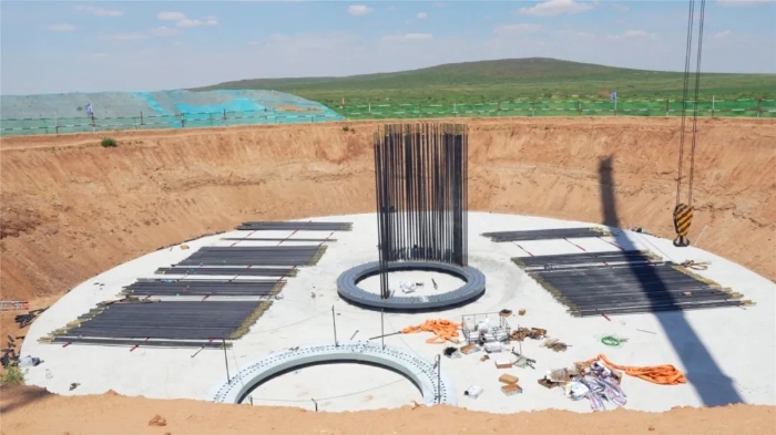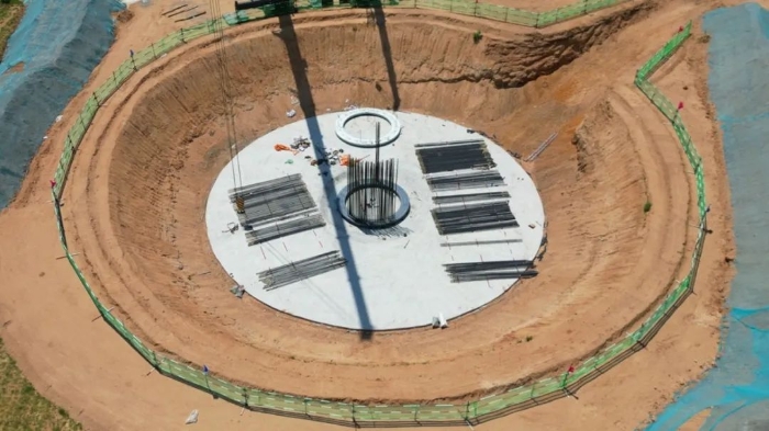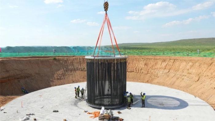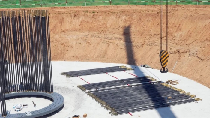 此次进行的是风电基础吊装,重达17吨的铆盘稳落在基坑,214根铆杆密集插装,每一根都必须精准插入孔位。