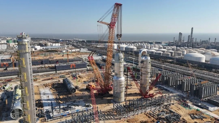 【挑战】华南某大型石化项目,一座“穿衣戴帽”后总重达2000吨的急冷水塔设备,需要平稳吊装就位。庞然大物,如何举重若轻?