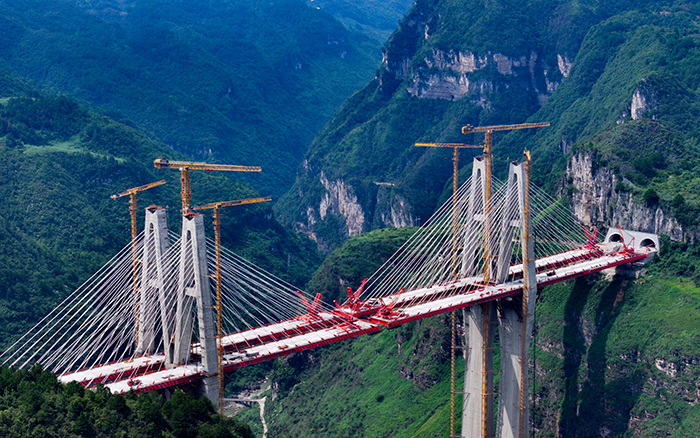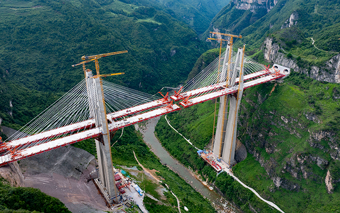 金旗特大桥是乌长高速公路全线控制性工程,桥梁全长672米,主塔总高度达300.6米。