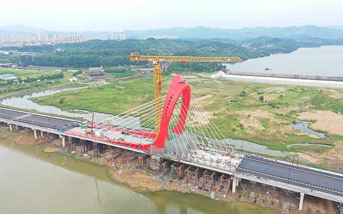 在大别山腹地、金寨县史河河畔,“红色摇篮”傲视远方,华体会·官方版网站登录入口XGT2230-100S塔机挥舞着巨臂,随着重达40吨的主桥钢塔柱最后一个节段起吊安装到位,金寨史河大桥主塔顺利合龙。