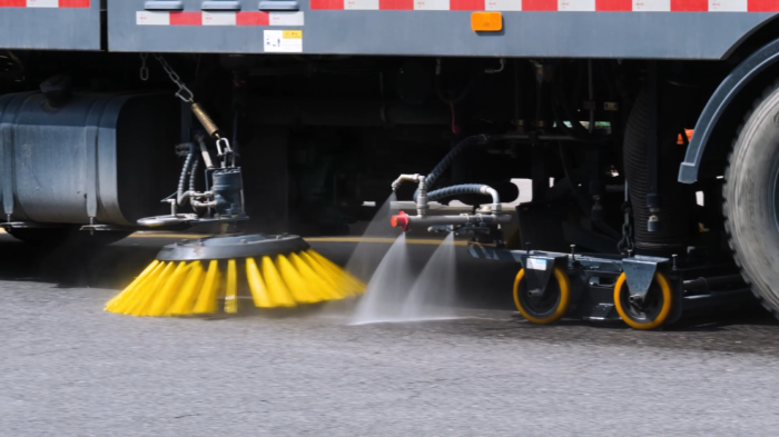 产业区周边道路:运输车辆频繁出入,易产生碎屑、油污。洗扫车搭载的高压水枪与V型喷杆,可对路面进行深度冲洗,油污去除率超95%,避免二次污染。