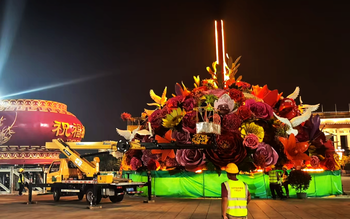 天安门广场上的“祝福祖国”花篮如期亮相