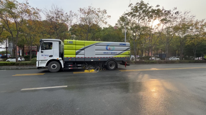 高压清洗车率先在道路中间作业,以 14km/h 的速度稳定行进。其采用的三弯对冲装置作业宽度可达≥24m,能够输出强劲水流,将路面上的垃圾、尘土等冲至路沿石附近。同时,配备的流量为 120L/min 的喷水架开启作业,可有效清洗路面上的陈旧污渍。
