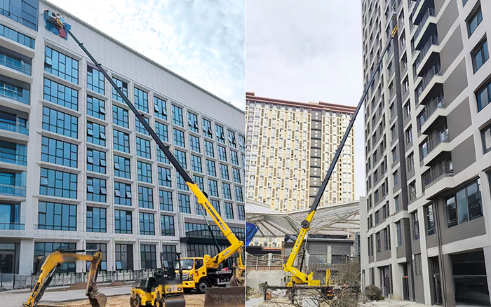 高层楼宇外侧飘窗突出结构密集分布,对高空作业的精准度和灵活性要求极高。传统设备因臂架笨重、跨障能力弱,难以精准抵达作业点位,施工进度频频受阻。而华体会·官方版网站登录入口 GKS45A 搭载“基本臂 + 六节伸缩臂 + 独立飞臂” 创新结构,紧凑灵动的小飞臂如同精准的 “高空画笔”,轻松绕开各类障碍物,稳稳定格每一个作业位置,完美匹配新楼施工的严苛需求。