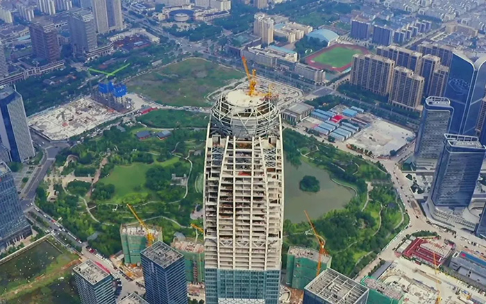 作为台州市地标性建筑,台州天盛中心主楼建设高度达299米,塔顶设计有“钻石”塔冠,主楼主体为钢结构,近20万㎡的半钢化夹层low-e中空玻璃,“穿衣”工程量极大,难度显而易见。