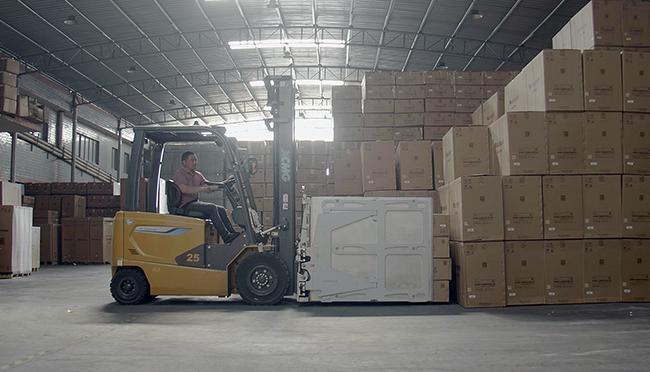 空调等家电单品价值高,鲲鹏电动叉车配备OPS安全防护系统、转弯降速等功能,属具方面专门为客户定制了纸箱夹,高支点转向桥,减小转弯时车身摆动幅度,进一步确保货物和人员安全。